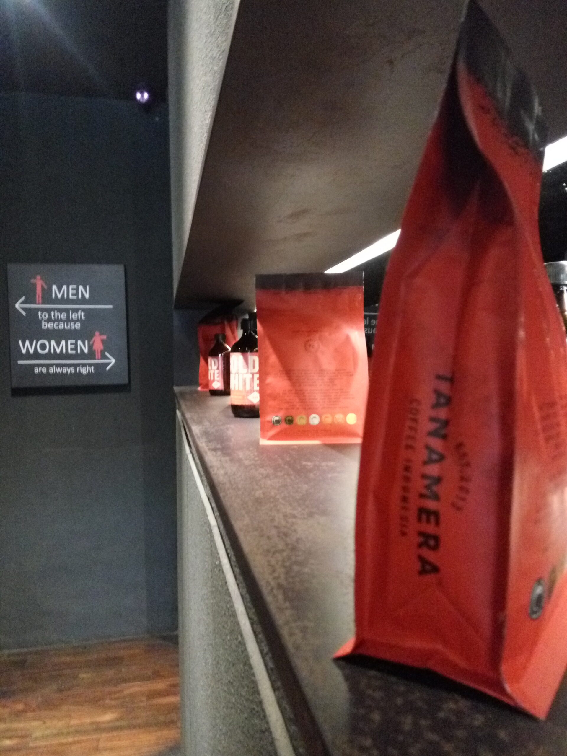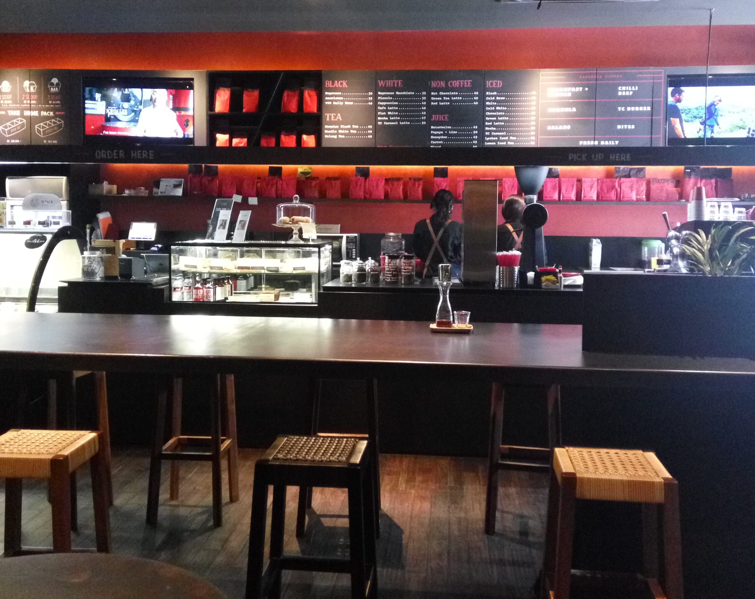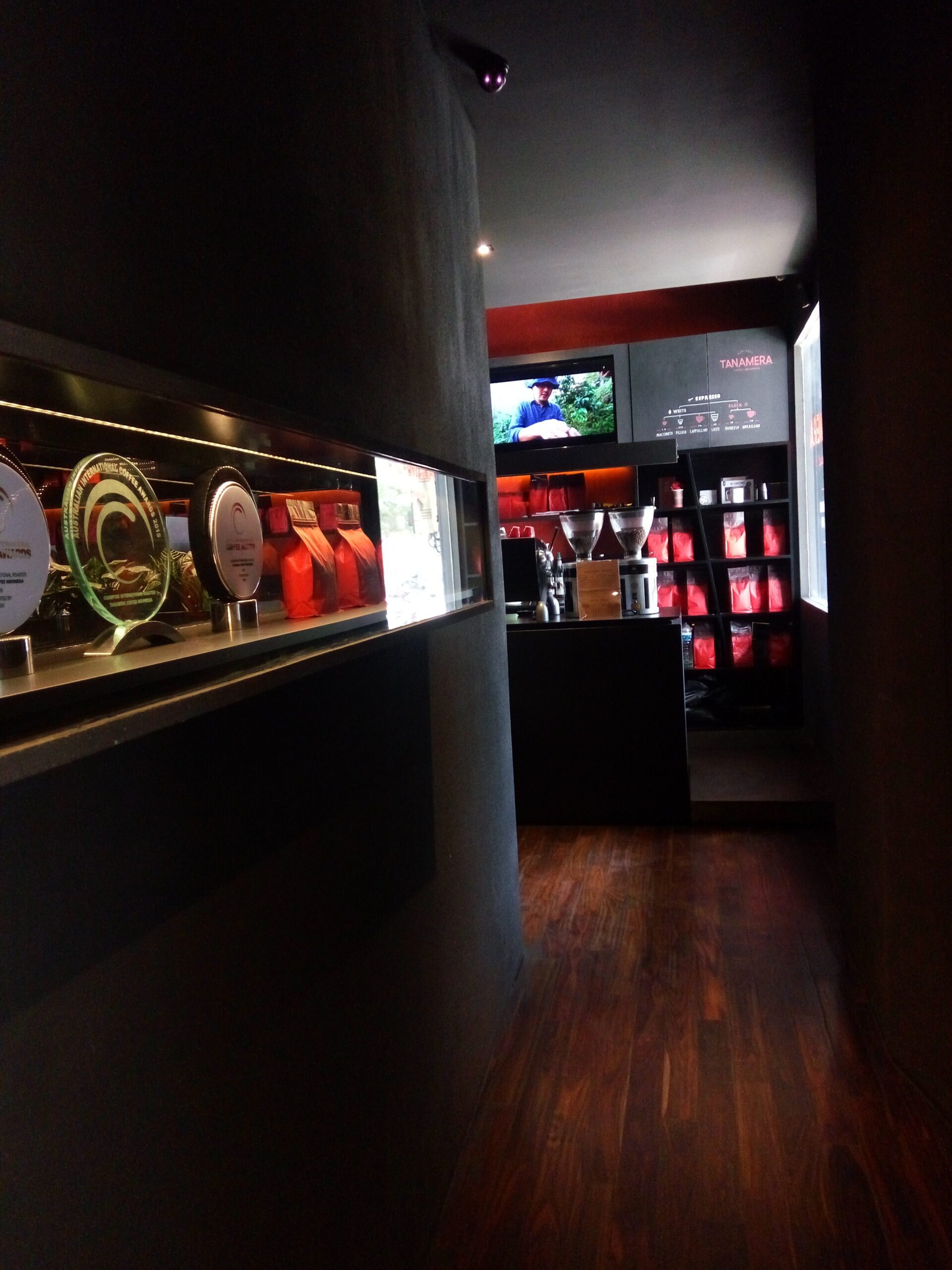 Ternyata sebuah pintu kecil yang posisinya di pojok fasadlah main entrance sesungguhnya. Peletakan pintu masuk seperti itu bukan tanpa maksud karena pengunjung ‘dipaksa’ melewati koridor dalam suasana hitam dengan warna merah khas Tanamera sebagai aksennya. Di koridor tersebut terdapat plakat penghargaan yang pernah diraih Tanamera dalam Australian International Coffee Awards dan beberapa kantung biji kopi.