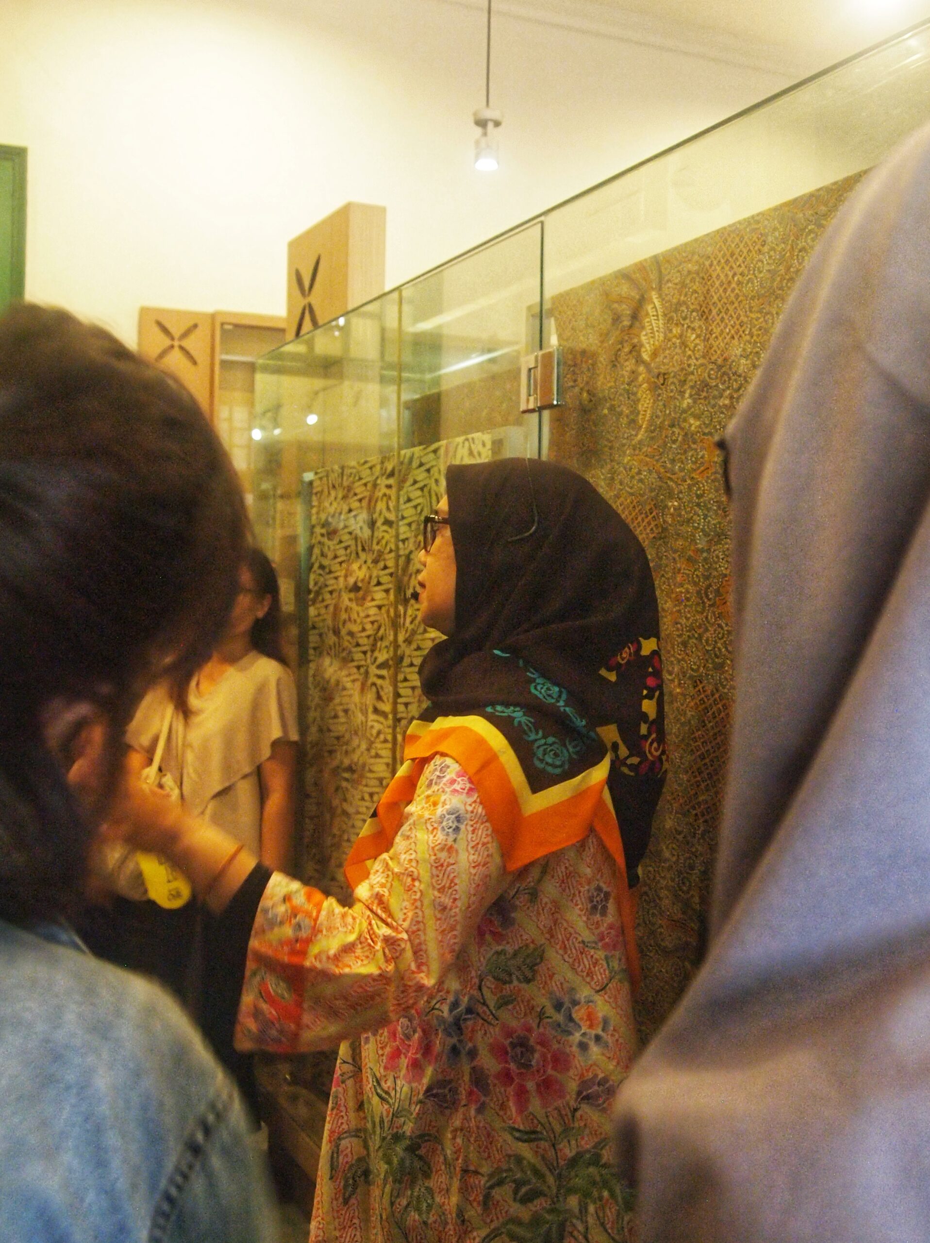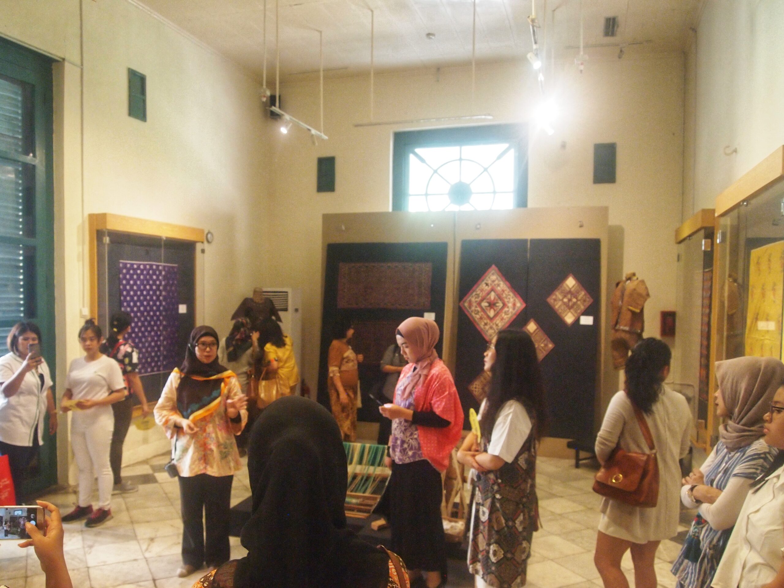 Dimulai dengan berkeliling ke dua area pameran, area pameran yang berada di dalam museum dan area pameran yang ada di dalam Galeri Batik. Pada kunjungan awal di dalam area museum, kami para undangan diajak memahami semua kain khas Indonesia. Mulai dari tenun hingga kain yang terbuat dari kulit kayu. Menarik, dan lebih menarik lagi, bila Anda belum mengetahui alat tradisional yang digunakan untuk memintal benang dan menenun kain yang saat ini sudah jarang digunakan, ada di juga di sini. Di area ini kita belajar, kekayaan kain Indonesia pun tidak melulu batik, masih banyak, tidak hanya puluhan bahkan ratusan jenis dan motif kain dari masing-masing daerah memiliki kekhasan dan ceritanya sendiri.