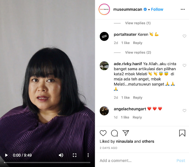 Perupa Melati Suryodarmo menjawab pertanyaan dari pengikut media sosial Museum MACAN yang disampaikan via Instagram Stories, tentang perjalanannya dalam bidang seni performans.