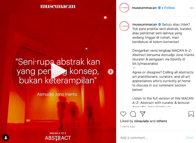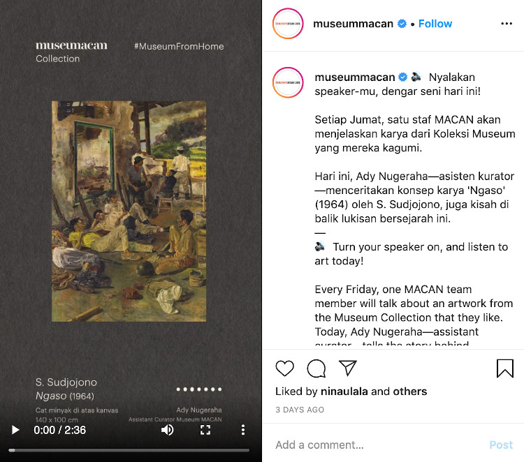NININMENULIS.COM – Wabah Covid-19 memang merubah semuanya. Anjuran untuk tetap stay di rumah melalui #DiRumahSaja membuat semuanya dilakukan di rumah. Mulai dari gaya bekerja, belajar, belanja, berolahraga, hingga bersosialisasi, semua dilakukan secara online melalui conference call dan live streaming. Lalu bagaimana bila kita ingin jalan-jalan sekadar refreshing sembari menambah wawasan? Museum MACAN berinisiatif untuk tetap melayani para pecinta seni agar tetap dapat menjelajah museum dan mengikuti rangkaian pameran yang telah diagendakan melalui #MuseumfromHome.